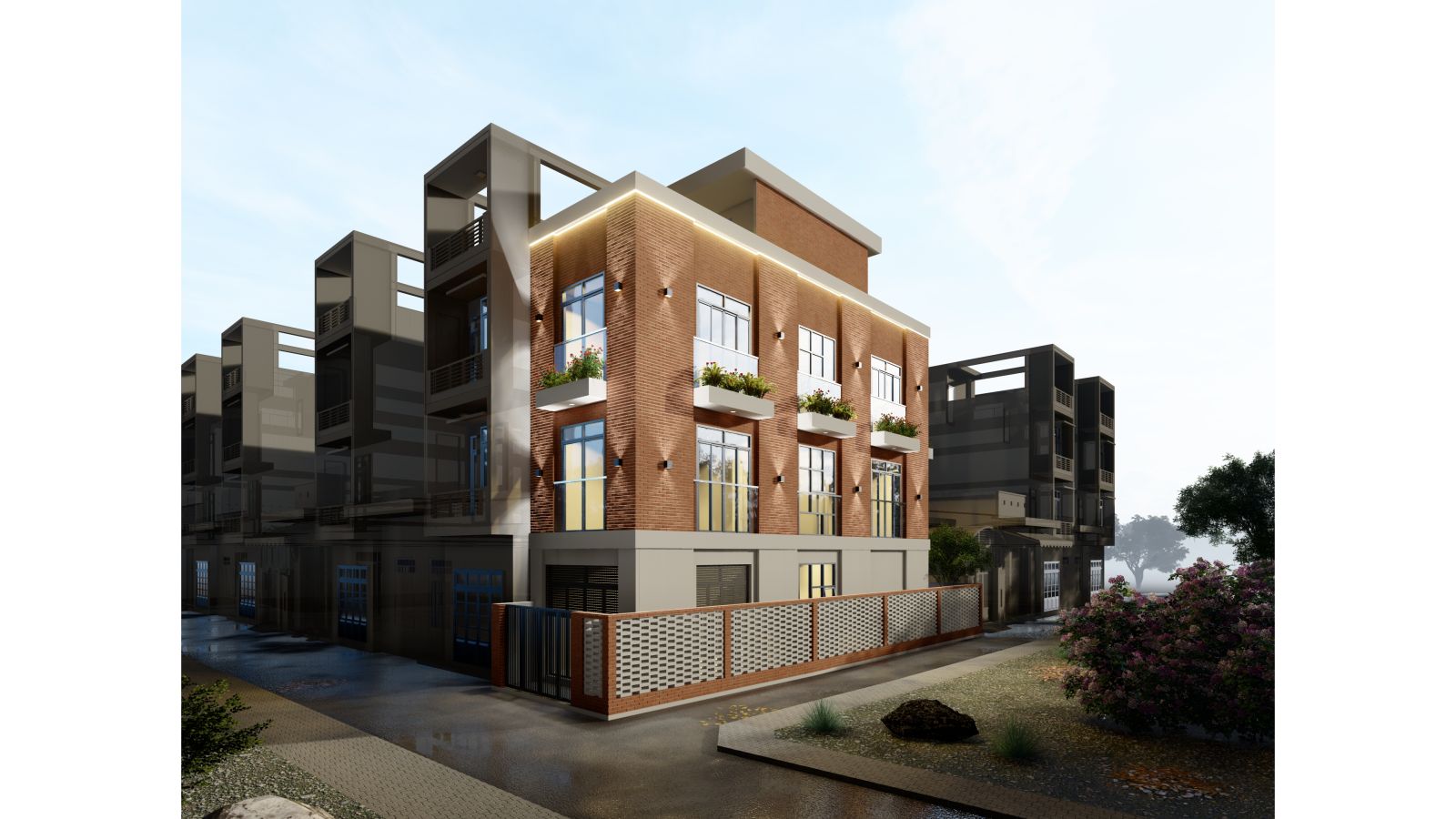 - Hàng rào gạch lỗ thông thoáng, đồng bộ với tổng thể công trình